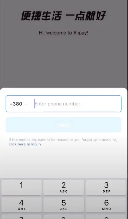 Let’s start with Alipay, go there and enter your phone number. Wait a few minutes and you will receive an SMS message. You need to enter it in the application to confirm your phone number. Nowadays, with the statistics on Apple devices, SMS comes better and more confidently.