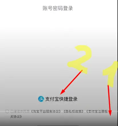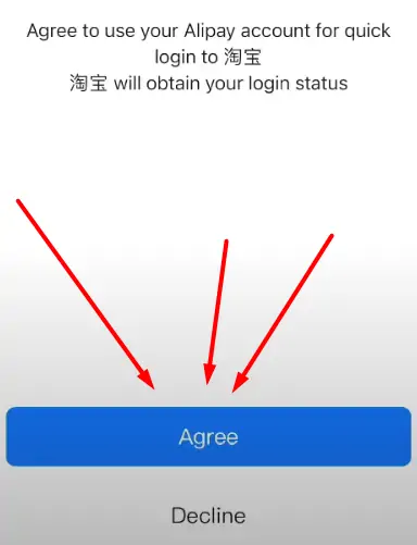 Now let’s go to Taobao. everything is visually simple here. at the bottom right, click on the icon. it will ask for a login, and at the bottom under the arrow 2, click on authorization through Alipay. You will be redirected to Alipay, where you confirm your login by clicking the aggre. If you are redirected, congratulations, everything worked and you are now registered on Taobao