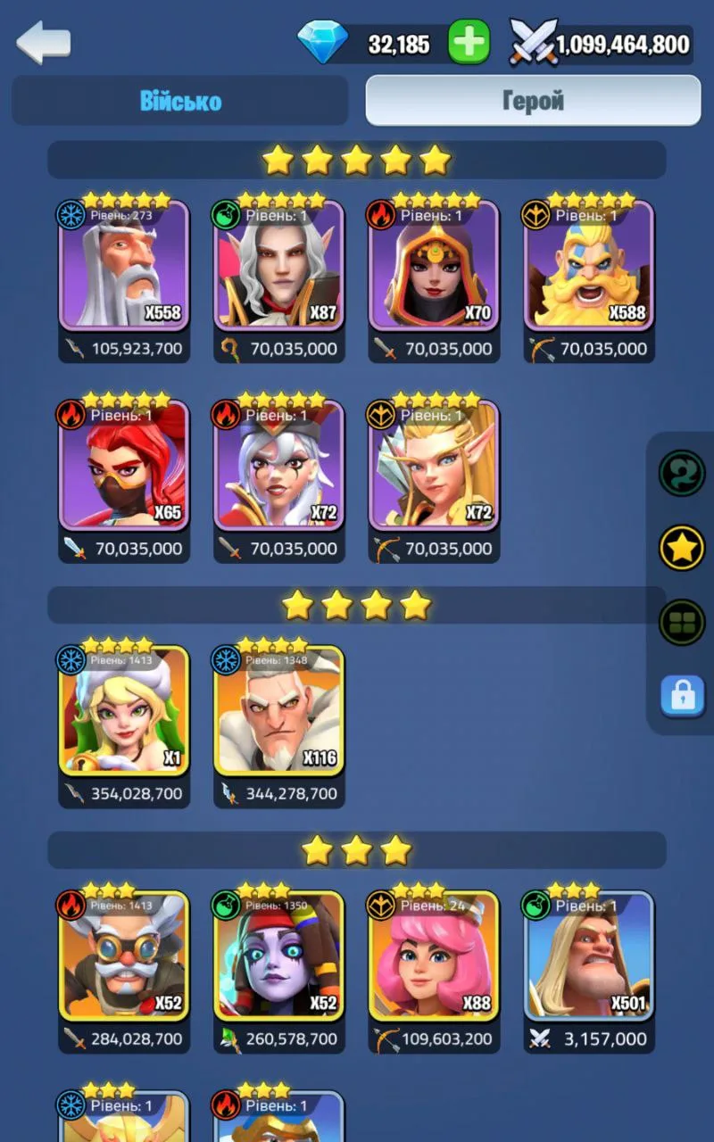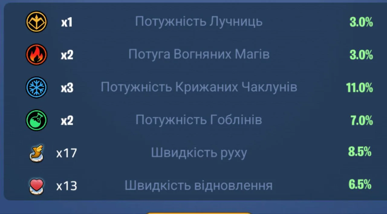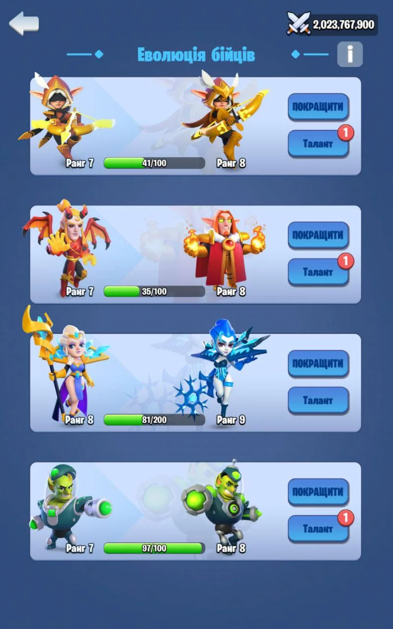 Perhaps unevenly pumping fighters is not the best option, but it is a very effective strategy. You need to start from the first point and pump the element that your alliance is primarily interested in and pumps. This gives a bonus to your heroes. As an example, my alliance specializes in ice and goblins, so I pump my fighters as much as possible.